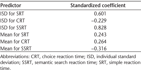 We examined the unique contributions of mean performance and IIV on predicting group membership using a discriminant function analysis. Mean reaction time and ISD scores for each CTIP task were included simultaneously in the analysis to determine which of these variables could best predict whether a participant belonged to the MS group or the control group. We did not include COVs of each CTIP subtest given that no significant differences between groups were found. The combined information about mean-level performance and IIV successfully predicted group membership (Wilks Λ = 0.54, χ2 6 [N = 36] = 19.138, P = .004) and correctly classified 83.3% of all cases. Table 2 presents the standardized weights of each predictor. These results indicate that ISD scores on the SSRT (β = 0.83) and the SRT (β = 0.60) were the best predictors for identifying whether a subject belonged to the MS group or the control group.