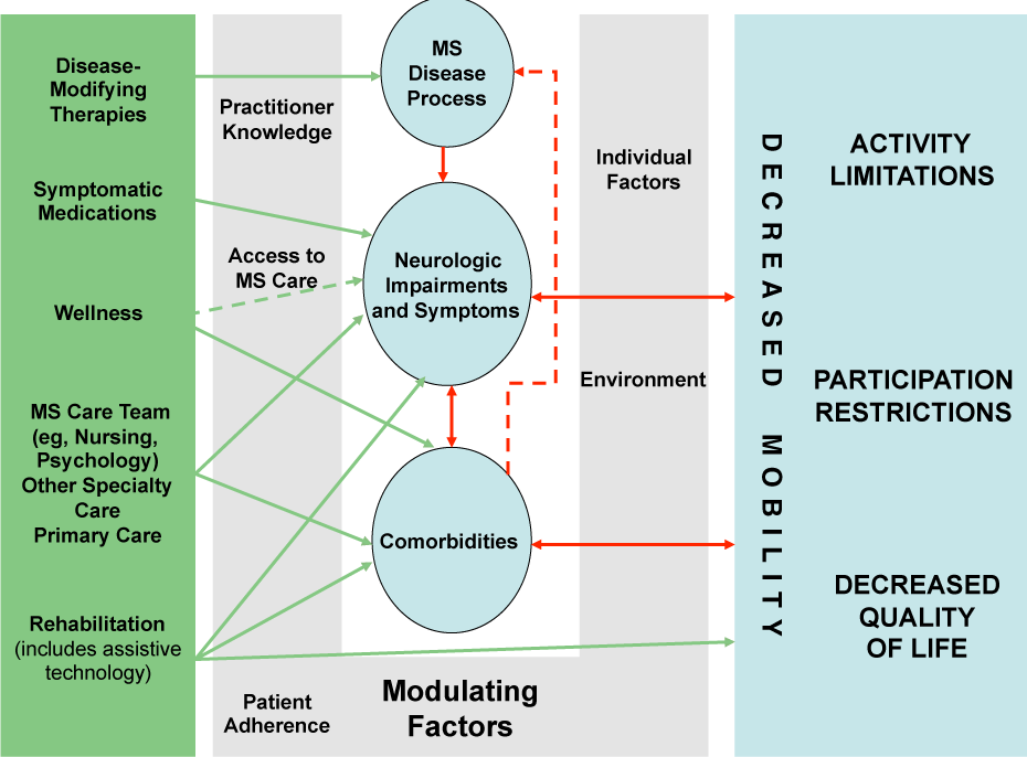 There are many personal, social, and environmental factors that influence the effect of MS and comorbidities on mobility, and the results of interventions. These factors may be intrinsic to the patient, such as personality, ability to adjust to the consequences of MS, spiritual background, premorbid activity level, and exercise routine. Or they may be external, such as the broad concept of environment, including geographic environment (eg, proximity to specialized MS care), physical environment (eg, stairs in the home, small bathroom that cannot accommodate a walker or a wheelchair), human environment (eg, presence of a spouse or family member to help at home), social and economic environment (education level, occupation, income, health-care insurance), and cultural environment (eg, cultural differences in handling disability and interacting with the health-care system). Access to care, practitioner knowledge, and patient adherence to treatment (medications, rehabilitation) are examples of factors that can affect the design and implementation of a plan of care. People living with MS often exhibit difficulty tolerating medications, rehabilitation interventions, and physical activity in general.