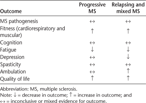 There are additional limitations of this report that should be considered. The purpose of this report was to explore the potential role of exercise training in people with progressive MS. We did not perform a systematic review or meta-analysis, and, therefore, other relevant literature may have been missed. Furthermore, the report may be subject to selection bias, the quality of the evidence examined was not formally evaluated, and we were unable to provide an overall quantitative effect for exercise training on the various outcomes examined.