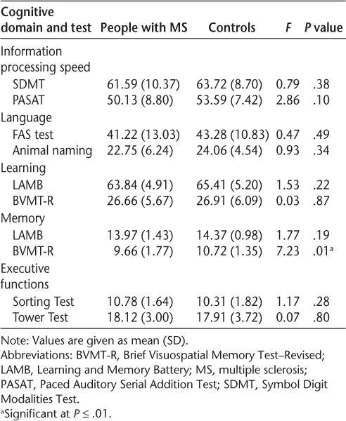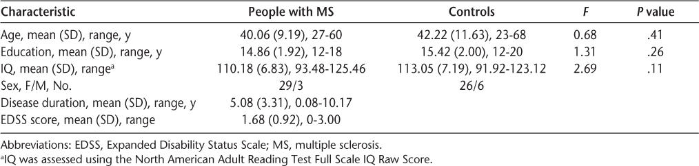 There was no significant difference between people with MS and controls in age, education, and IQ scores, and a χ2 analysis revealed no significant difference in sex distribution between the two groups (χ2 = 1.16, P = .28) (Table 1).