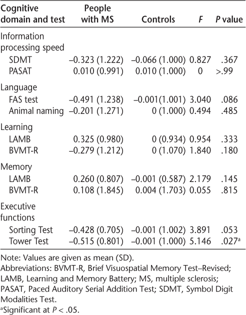 Over time, the groups differed significantly regarding the degree of change on the Tower Test: RCIMS = −0.515 (0.801); RCIcontrol = −0.001 (1.000). Despite the change in cognition being significantly different between groups, a t test showed no significant difference between baseline and follow-up performance in people with MS (t = 1.81, P = .08). An RCI of 0 indicates no change. Results herein indicate that although the MS and control groups improved over time, the MS group improved less than the control group. No other significant group differences were observed.