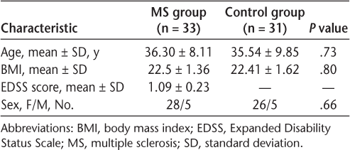 Thirty-three patients diagnosed as having MS and 33 healthy people as a control group participated in the study. Two participants in the control group were reluctant to perform the tests, so the data from 31 control participants were analyzed. The mean ± SD time from the diagnosis of MS was 90 ± 5 months (range, 12–216 months). Demographic data for the participants are summarized in Table 1. There were no statistically significant differences between the groups at baseline.