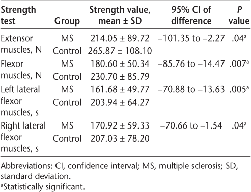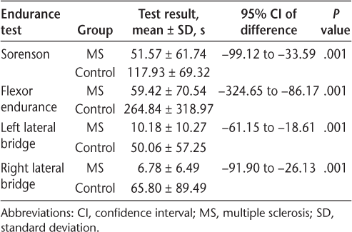 The present results revealed that patients with MS had significantly lower performance in endurance and strength tests of core muscles compared with a matched control group. To our knowledge, this was the first study comparing the endurance and strength of core muscles in patients with MS and a healthy group.