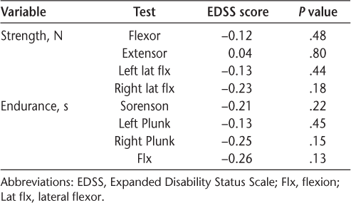 Data were analyzed using SPSS for Windows version 16.0 (SPSS Inc, Chicago, IL). Descriptive statistics were used for reporting means and standard deviations (SDs) of the variables. The normal distribution of data was confirmed using the Kolmogorov-Smirnov test. The endurance and strength of the core muscles were compared between the groups using the independent-samples t test. The Pearson correlation coefficient was calculated to evaluate the correlation between strength and endurance variables and EDSS scores. Statistical significance was set at P < .05.