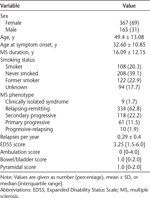 A monocentric, cross-sectional, retrospective review of prospectively collected data from 532 research-consented patients seen at Saskatoon MS Clinic was performed. Data were collected from a database and electronic medical records.