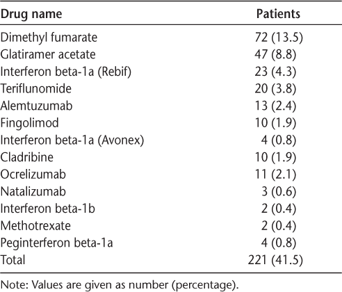 The total study population of 532 patients had a female to male ratio of 2.2:1. Table 1 shows the clinicodemographic profile of the study population. In terms of MS phenotypes, the highest frequency was of relapsing-remitting MS (RRMS) (334 patients [62.8%]), followed by secondary progressive MS (118 patients [22.2%]). Of the study population, 200 (37.6%) were continuously on DMT since diagnosis, 146 (27.4%) were never on DMT, and 186 (35.0%) were in the interrupted DMT group. The most common DMTs prescribed were dimethyl fumarate (n = 72 [13.5%]), followed by glatiramer acetate (n = 47 [8.8%]) (Table 2). A moderate negative correlation was found between age and number of relapses per year (rs = −0.608, P < .001), indicating that relapses per year were decreasing with increasing patient age in this study cohort. However, moderate positive correlations were found between age and EDSS scores (rs = 0.504, P < .001) and between disease duration and EDSS scores (rs = 0.454, P < .001).