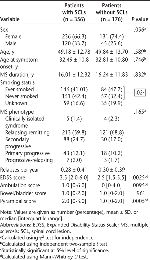 Of the 532 study patients, 356 (66.9%) had SCLs; of these, 150 (42.1%) had both cervical and thoracic cord lesions, 180 (50.6%) had only cervical cord lesions, and 26 (7.3%) had only thoracic cord lesions. Table 3 shows the differences between the clinicodemographic profiles of patients with SCLs and patients without SCLs. The median EDSS score of patients with SCLs was higher than that of patients without SCLs (3.5 vs 2.5, P = .0025). In terms of functional scores, the median ambulation and pyramidal scores of patients with SCLs were statistically significantly higher than those of patients without SCLs. Table S1, which is published in the online version of this article at ijmsc.org, compares the clinicodemographic profiles of patients with and without SCLs with EDSS scores of at least 6. The patients with SCL with an EDSS score of at least 6 were younger, with a mean ± SD age of 57.09 ± 11.15 years, than patients without SCLs with EDSS scores of at least 6 (mean ± SD age, 61.41 ± 9.18 years).