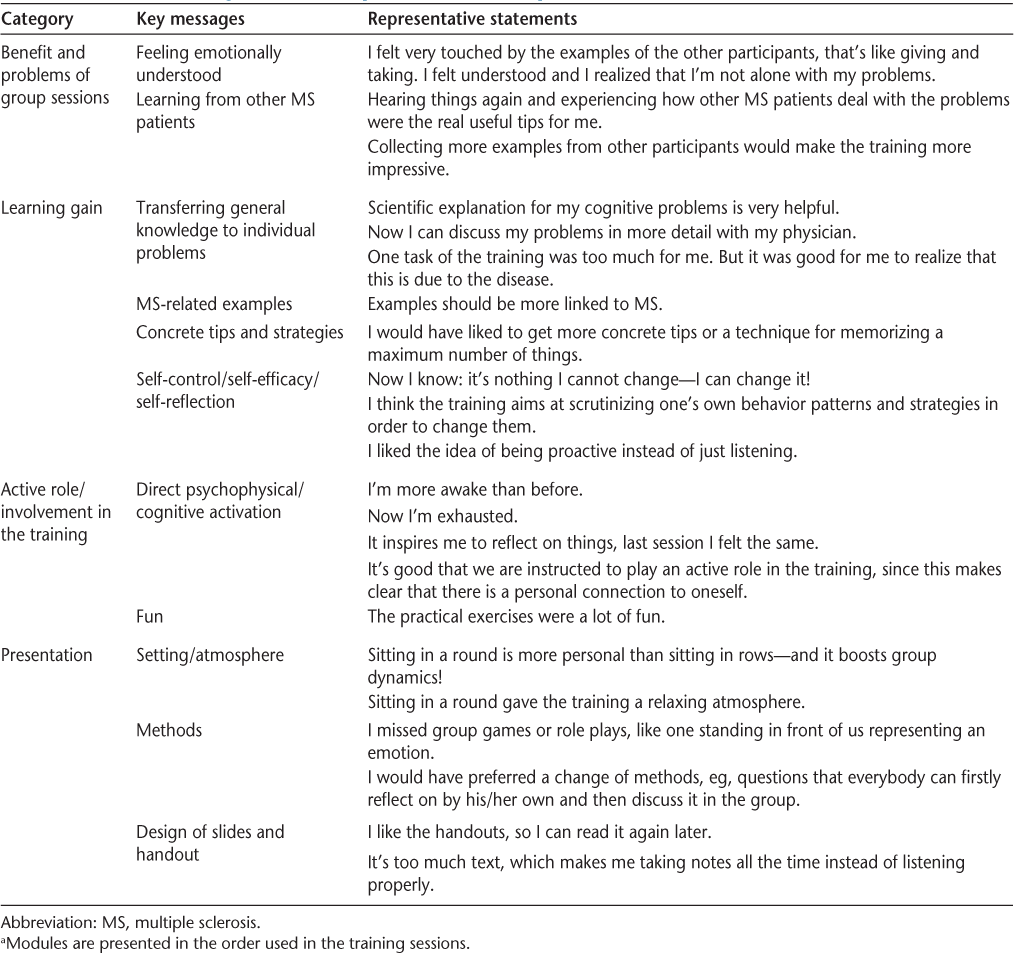 Participants' statements about the training allocated to the derived categories for each module are presented in Table 1. Comments include direct psychological and behavioral reactions during the training, mediated key and take-home messages, and overall assessments of the training. No participant judged the training unnecessary or unsuitable. All participants pointed out that there is a dearth of training programs to improve psychological and cognitive impairment in MS in Germany, including rehabilitation centers. Regarding the formal training presentation, all participants approved the curriculum, including the theoretical framework, the exercises, and the interactive group involvement. Participants assessed the background information on the evidence of cognitive and psychological impairments in MS as being very important. The exchange with other group members was highly valued; participants felt relaxed and accepted by the group while realizing that others had the same problems. They also valued being exposed to experiences and strategies of other group members.