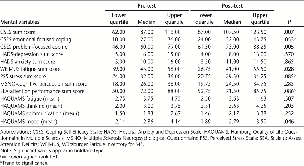 Results: The modules were highly accepted by patients. Pre-post assessments showed significant improvements in the Coping Self Efficacy Scale (P = .007), the Würzburger Fatigue Inventory for MS Score (P = .028), and the Hamburg Quality of Life Questionnaire in Multiple Sclerosis Mood subscale (P = .046).