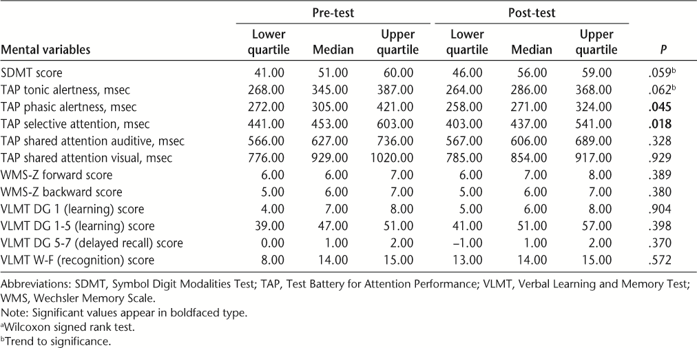 One major problem with neuropsychological interventions is the selection of a clinically relevant primary outcome. Improvement in a neuropsychological measure may not necessarily be relevant for the patient's daily life, while, conversely, lack of change may not exclude enhanced ability of patients to cope. However, to the best of our knowledge, studies in the area of neuropsychological abnormalities and daily functioning are scarce. In our cohort, we found some improvements in the attentional domains measured by TAP, but no differences in memory tasks or in learning and recognition. Change scores may be partially explained by practice effects.