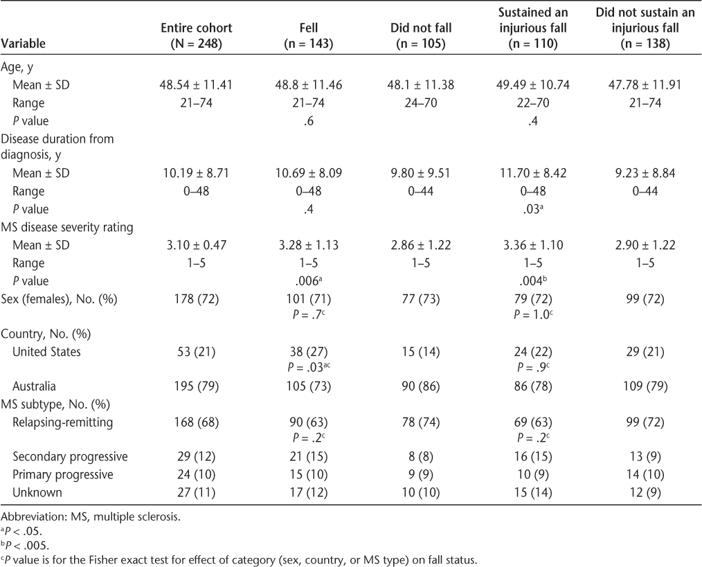 The demographic and MS disease characteristics of the study participants are summarized in Table 2. The participants' mean age was 48 years, 72% were female, and 68% had relapsing-remitting MS. This age, sex, and MS disease subtype distribution is typical for people with MS. The mean duration of disease was 10 years, and the mean disease severity rating was 3.1 (ie, some support needed for walking). Forty percent of the sample reported using a walking aid. A higher proportion of the US sample fell compared with the Australian sample. Those who fell and those who sustained an injurious fall had more severe disease than nonfallers, and those who sustained an injurious fall had statistically significantly longer duration of disease than those who did not sustain an injurious fall.