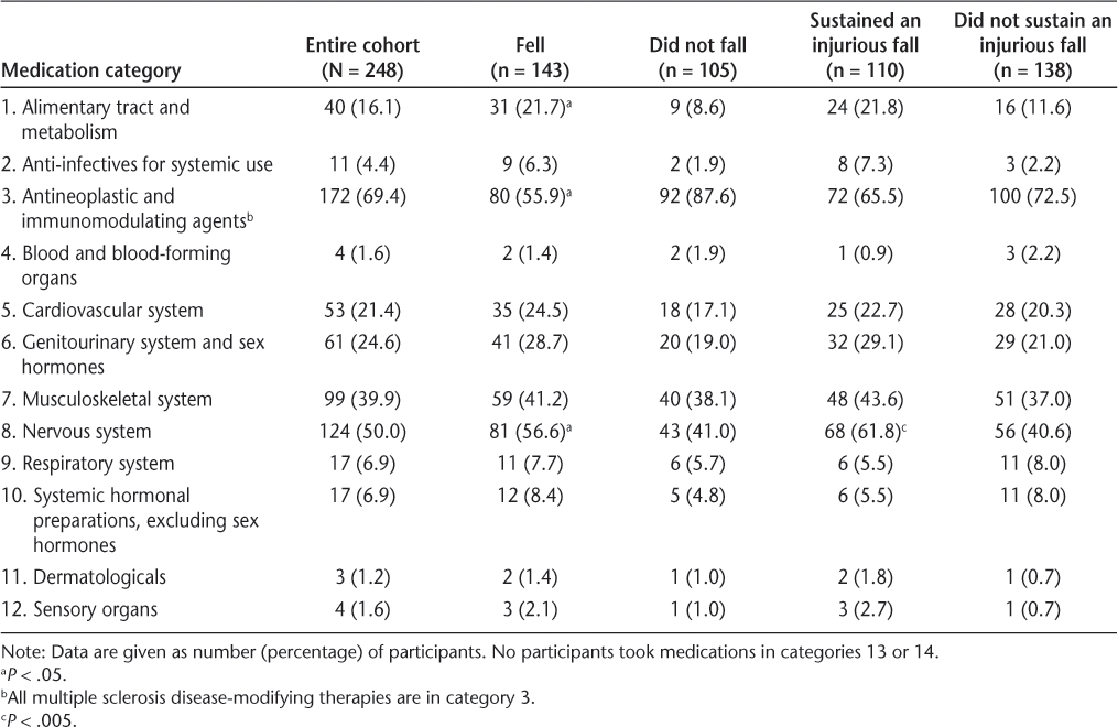 Results: Participants reported taking a median of three medications and two supplements. A total of 143 participants (58%) fell at least once in the 6 months, and 110 (44%) experienced one or more injurious falls. The adjusted relative odds of a fall or an injurious fall increased by 13% (P = .048) and 11% (P = .049), respectively, for each medication and by 43% (P = .015) and 55% (P = .001) for each neurologically active medication. Reported use of MS disease-modifying therapy was associated with 48% decreased odds of falling (P = .035) but not significantly decreased odds of injurious falls.