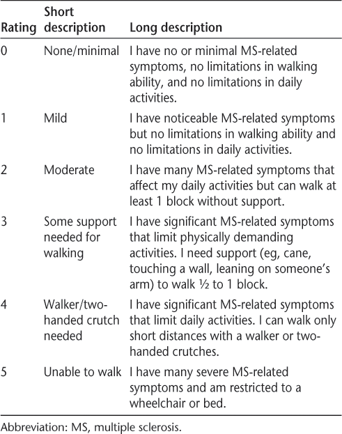 Demographic data (age and sex), years since MS diagnosis, MS subtype, and other medical conditions were obtained by medical record review and self-report questionnaires at baseline. MS-associated disability was determined using the self-reported MS Disease Severity Rating Scale.19 This scale allows participants to rate their disease severity from 0 (having minimal MS-related symptoms and no walking limitations) to 5 (having severe MS-related symptoms and being unable to walk) (Table 1). This scale was designed to provide patients with an easy-to-use measurement of their own condition by incorporating disability, symptom severity, and the impact of disease severity on daily activity into one rating scale. This scale was selected for this study owing to its ease of use compared with the self-rated EDSS. Scores on the MS Disease Severity Rating Scale correlate highly with neurologist-rated EDSS scores (r = 0.85).19
