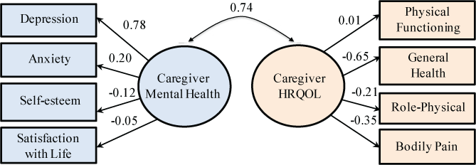 A canonical correlation was computed to examine which specific aspects of caregiver mental health were most linked to which specific aspects of HRQOL. Figure 1 illustrates the conceptual basis for and results of the first canonical correlation. In this figure, the canonical variates of shared variance in a single variable set (shown in circles) are derivations of the two sets of measured variables (shown in rectangles).