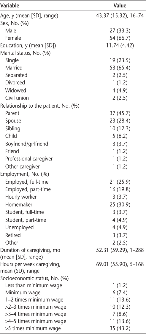 Before commencement of the study, the protocol was reviewed and accepted by the ethics committee at the Mexican Foundation for Multiple Sclerosis. Eighty-six MS caregivers were recruited from the Mexican Foundation for Multiple Sclerosis and the Department of Neurosciences of the University Center for Health Sciences, University of Guadalajara, Guadalajara, Mexico. Medical records were accessed and reviewed at these locations. Individuals were eligible to participate in the study if they had cared for a person with MS for at least 6 months. Caregivers were excluded from the study if they had a previously diagnosed neurologic disorder, psychiatric disorder, or serious developmental disability that would prevent them from completing the measures. Caregivers who met the inclusion criteria were then contacted by telephone. Two master's-level psychologists (AAA, BVRB) were responsible for recruiting and consenting the participants and for verbally administering the assessments. Five of the caregivers who were contacted refused to participate in the study, leading to a final sample size of 81 caregivers. Demographic information for the caregivers and patients (reported by the caregiver) is summarized in Tables 1 and 2, respectively.