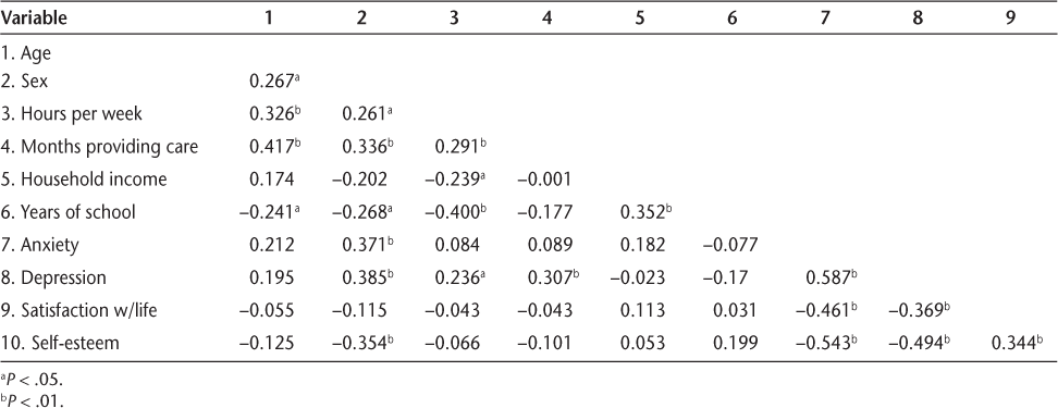 A correlation matrix was calculated to examine associations between demographic characteristics (age, sex, hours per week spent caregiving, duration of caregiving, household income, and years of education) and mental health variables (anxiety, depression, satisfaction with life, and self-esteem) (Table 4). The purpose of this analysis was to identify demographic characteristics to control for in step 1 of each regression, where appropriate. Anxiety was positively associated with female sex. Depression was positively associated with female sex, hours per week spent caregiving, and duration of caregiving. Satisfaction with life was not associated with any demographic characteristics. Finally, male sex was the only demographic characteristic associated with self-esteem.