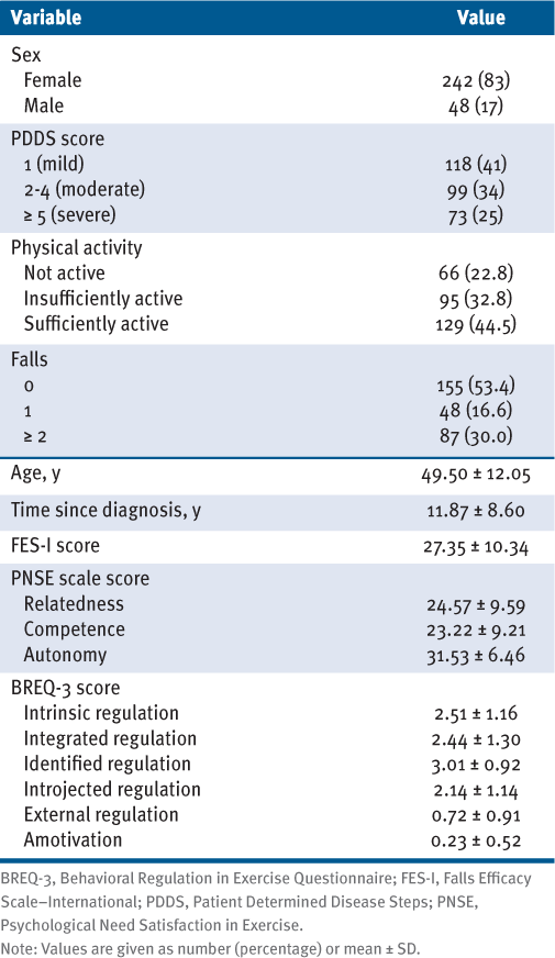 Participants included 290 individuals with MS: 242 women and 48 men aged 22 to 71 (mean ± SD age, 49.50 ± 12.05) years. Mean ± SD time since diagnosis was 11.87 ± 8.60 years, with falls ranging from 0 to 25 across the sample. Forty-one percent of respondents reported mild mobility impairment (PDDS score of 1), 34% reported moderate gait disability (PDDS score of 2–4), and 25% had substantial mobility impairment (PDDS score ≥ 5). Only 44.5% of the study sample met the recommended level of 150 minutes of MVPA. TABLE 1 provides demographic details of the study participants.