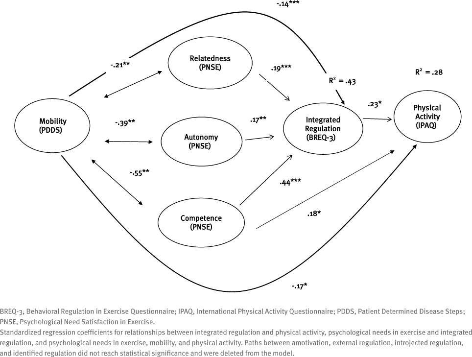 Path analysis revealed that PA was best predicted by integrated regulation, competence, and mobility, explaining 28% of the variance in PA behavior. All 3 need satisfaction variables (relatedness, competence, and autonomy) and mobility impairment accounted for 43% of the variance in integrated regulation.