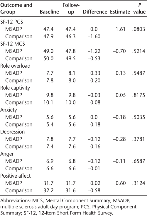Use of MSADPs had a significant effect on SF-12 PCS scores (Table 1). The mean SF-12 PCS scores of the MSADP group increased, and those in the comparison group decreased from baseline to follow-up. However, this difference of 1.43 was below the threshold of 3 to 5 points that is generally considered clinically meaningful for SF-12 PCS scores.35–37 For persons with MS, there was little change in any of the other outcomes between baseline and follow-up in either the MSADP group or the comparison group. As such, there were no significant effects of the program on any of the other outcome measures. For caregivers, there was little change in the outcomes between baseline and follow-up in either the MSADP group or the comparison group (Table 2).