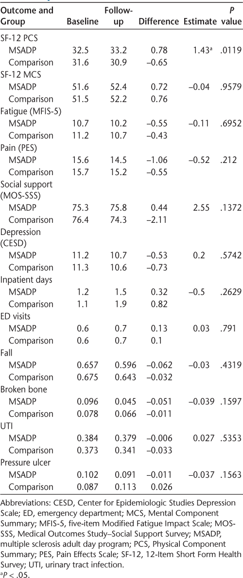 Using a quasi-experimental design, outcomes between baseline and 1-year follow-up in persons with MS and informal caregivers who used MSADP services and a comparison group of similar persons with MS and caregivers who did not use MSADP services were compared. For persons with MS, outcomes included standardized measures of physical and mental HRQOL and health care utilization. For caregivers, outcomes included physical and mental HRQOL and well-being. Changes in outcomes between baseline and follow-up were examined using propensity score–weighted difference-in-differences regression analysis.