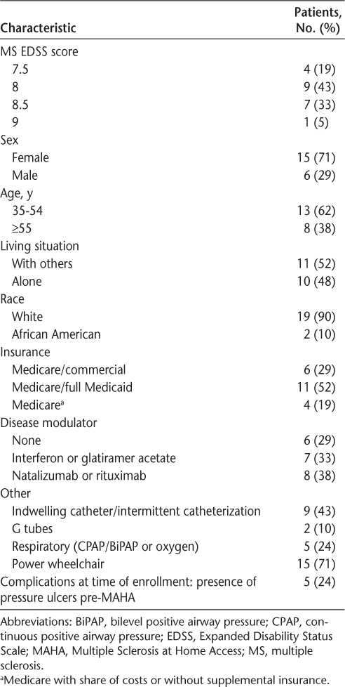 The MAHA program began in February 2014; as of January 2017, 28 patients living in the community were enrolled, and 21 completed at least 1 year of the program. Of the 28 enrolled, seven patients did not complete the full year due to placement in a long-term care facility (n = 1), inability to comply with program requirements (n = 2), discharge from the program (eg, no longer met eligibility requirements of homebound) (n = 1), and death (n = 3). Table 1 provides the baseline characteristics of the 21 patients enrolled in the program for at least 1 year. Fifteen patients (71%) were women, 13 patients (62%) were younger than 55 years, and nearly half lived alone. All the participants were enrolled in Medicare, Medicaid, or both, and 11 (52%) were Medicare/full Medicaid waiver eligible, with income equal to or below the federal poverty level. More than two-thirds of the participants used power mobility wheelchairs associated with upper extremity dysfunction. Seven patients either had swallow dysfunction and used a gastric tube or needed respiratory support (continuous positive airway pressure/bilevel positive airway pressure). On enrollment in the program, five patients had varying stages and sizes of pressure/decubitus ulcers.