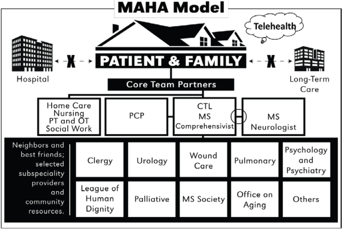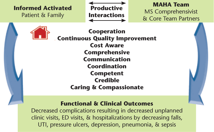 The structure of the MAHA program (Figure 2) included multidisciplinary core team partners, composed of care providers who maintained ongoing hands-on care and frequent home visits, with the intent of fostering trusting relationships between patients, families, and providers. Core team partners included a house call provider, a nurse practitioner (NP), a medical assistant, personal caregivers (including family), and, generally, a skilled home health care team that included nursing and physical/occupational therapists. A unique expanded role of the house call provider, termed the MS comprehensivist, was also developed. This individual was a provider with prescriptive privileges, subspecialty training in MS, and primary care experience managing patients with chronic illness. The comprehensivist served as an integrator, implementing the co-management concept in the PCMH model and bridging primary and subspecialty care, and functioned as the care team leader.