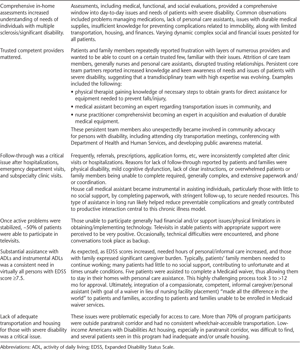 Table 4 includes common themes, lessons learned, and insights that emerged over the first year of operation, identified by patients, family members, and providers. Key findings included benefits of assessments in homes, importance of clinical expertise and continuity of care, close follow-up, need for greater assistance with ADLs, benefits of supplemental televisits, and greater awareness of societal limitations for the disabled, including transportation and housing.