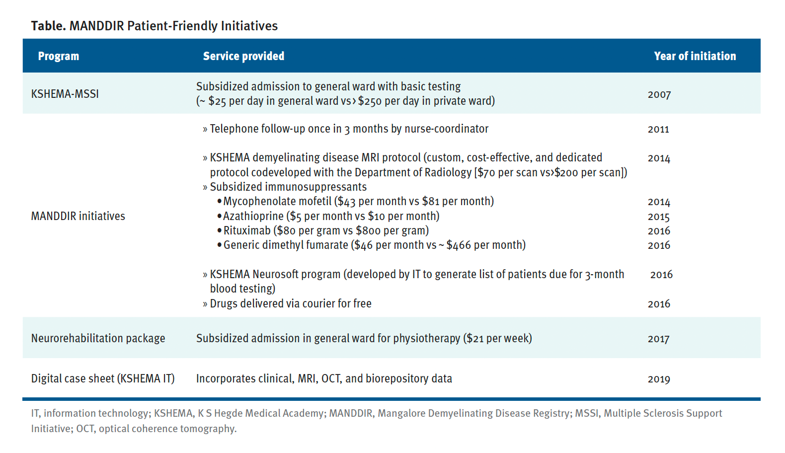 Despite many challenges, MANDDIR developed into a sustainable model of care for people with MS through a collaborative effort with several stakeholders, including administrators, pharmaceutical companies, and philanthropists. Off-label therapies and subsidized care are at the core of our management strategy. MANDDIR is, above all, a patient-centric, physician-driven effort by a small team, and I strongly believe that our model is replicable in other low-income settings.
