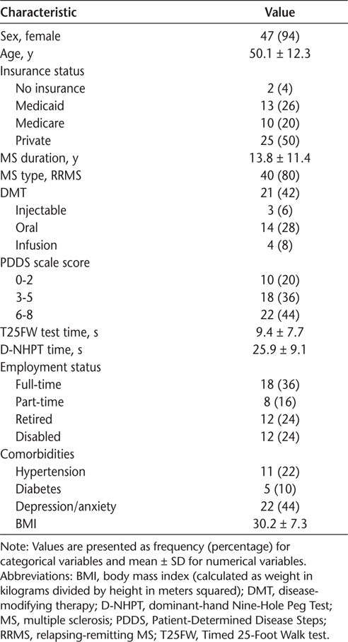 The electronic medical record and MS performance testing data11 were reviewed for demographic information, health insurance status, MS disease history, Patient-Determined Disease Steps scale score, Timed 25-Foot Walk test time, dominant-hand Nine-Hole Peg Test time, employment history, comorbidities, body mass index (BMI), Patient Health Questionnaire-9 (PHQ-9) scores, and Patient-Reported Outcomes Measurement Information System (PROMIS) scores.
