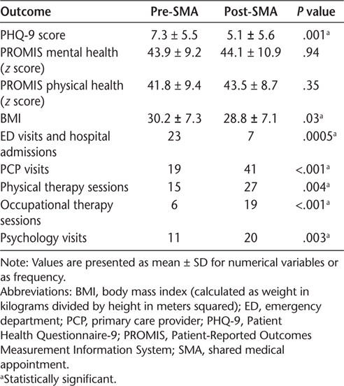 We reviewed data on all patients who participated in the SMA from January 2016 through June 2019. The following data were collected 12 months pre/post SMA visits: demographics, body mass index, patient-reported outcomes, and health care utilization. Data were compared using the Wilcoxon rank sum test.