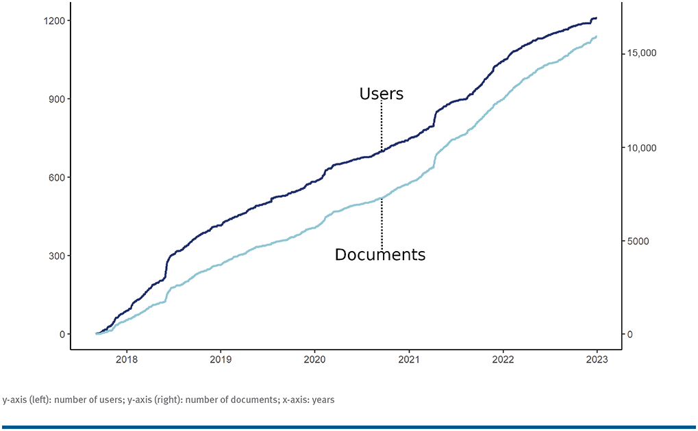 MyMS was used by 1201 patients in January 2023. The number of MyMS users has increased linearly since it was launched in 2017. FIGURE shows the cumulative progression of MyMS users as well as the cumulative progression of filled documents from 2017 to the beginning of 2023.