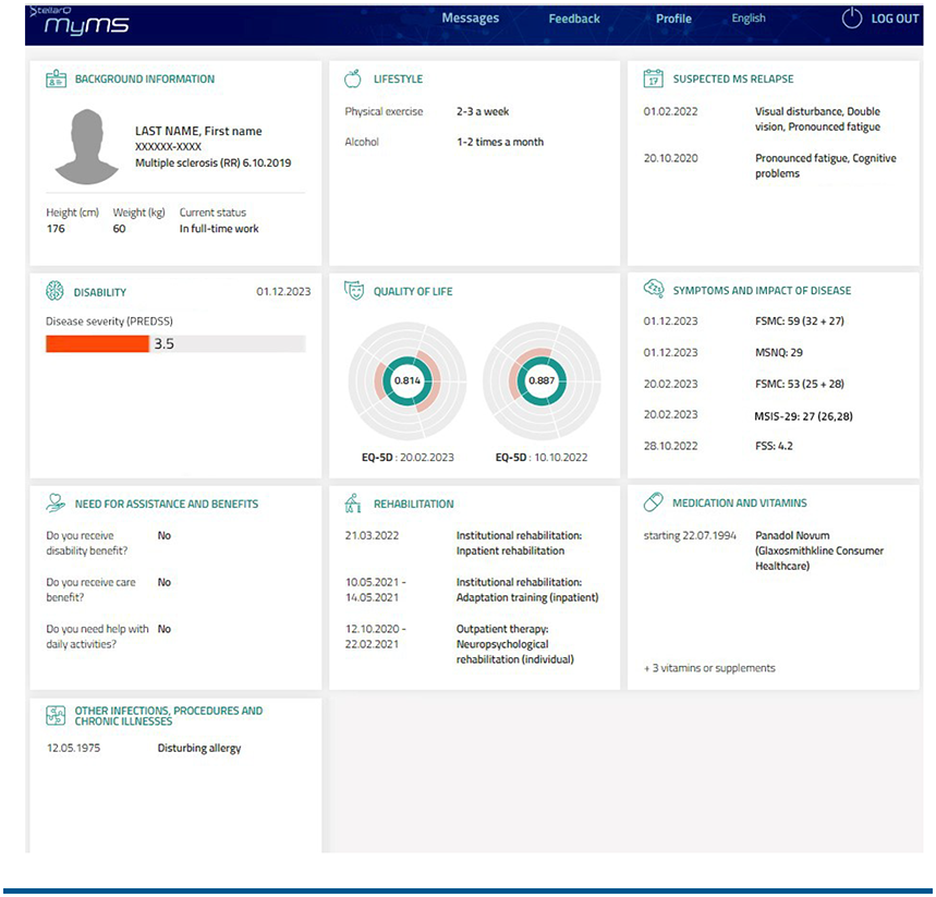Patient-generated data are a cornerstone of individualized multiple sclerosis (MS) treatment. MyMS, an interface for patient-reported outcomes (PROs) was developed by the Finnish MS Register to enable systematic collection of PROs.