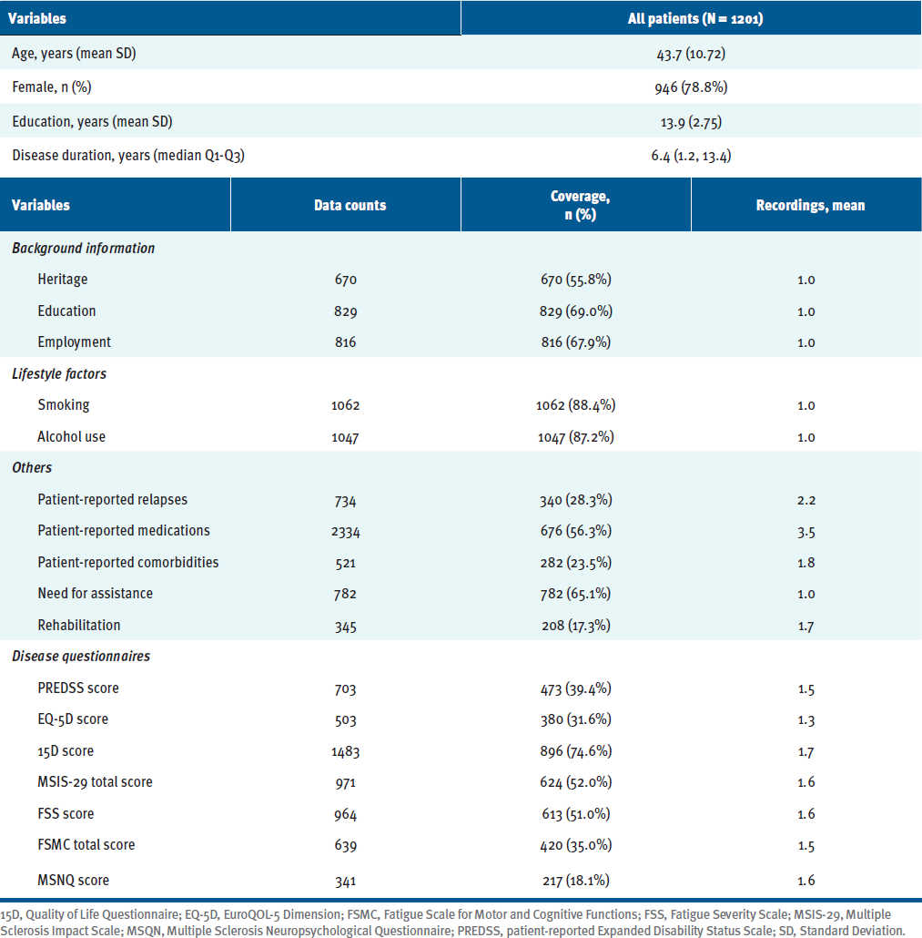 MyMS collects data on demographics, lifestyle factors, disease-related factors, and validated questionnaires, including the Quality of Life Questionnaire (15D), the Multiple Sclerosis Impact Scale (MSIS-29), and the Fatigue Severity Scale (FSS). At the end of 2020, the patient-reported Expanded Disability Status Scale (PREDSS), the EuroQOL-5 Dimension (EQ-5D), the Fatigue Scale for Motor and Cognitive Functions (FSMC), and the Multiple Sclerosis Neuropsychological Questionnaire (MSNQ) were added.