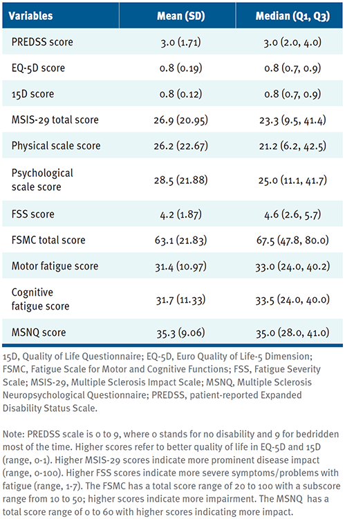 The mean PREDSS score (n = 473) is 3.0, which means the average patient has no walking ability limitations, but has other significant MS-related problems that limit daily activities (TABLE 2). The mean EQ-5D (n = 380) and 15D scores (n = 896) were both 0.8, indicating mildly compromised QOL.11,12 The mean MSIS-29 scores (n = 624) were between 26.2 and 28.5, which indicates few problems13 or mild disease impact.20 The mean FSS score (n = 613) was 4.2, equating to mild self-perceived fatigue.15 In contrast, the FSMC scores (n = 420) seemed to indicate severe overall fatigue (mean score 63.1) as well as moderate motor (means core 31.4) and cognitive fatigue (mean score 31.7).17 The mean MSNQ score (n = 217) was 35.3, which means that the patient perceives problems with cognitive functions.19