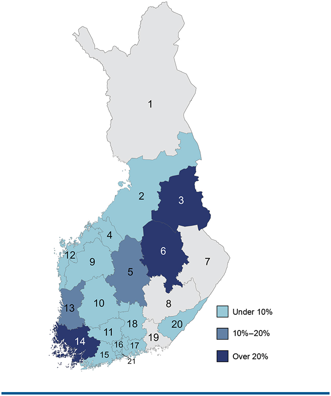 A total of 11,349 MS patients (G35) and 692 patients with unspecified demyelinating disease of the central nervous system (G37.9) were registered with the Finnish MS Register as of January 2023. There are 4 well-being services counties that do not use the MS register (FIGURE S2; coded as 1, 7, 8, and 19). In 12 counties, MyMS is considered inactive (ie, coverage under 10%). There are 3 counties (3, 6, 14) with MyMS coverage exceeding 20%.