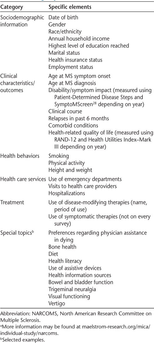 Clinician-reported data commonly include diagnosis, disability status as assessed on neurologic examination (eg, using the Expanded Disability Status Scale26), relapses, and use of disease-modifying therapy. Performance-based measures provide a standardized means of assessing functional abilities, distinct from what the clinician assesses or the perceived performance of the participant. The Timed 25-Foot Walk test is one such measure.27 Patient-reported data may encompass a broad range of information, including sociodemographic characteristics, health services use, and PROs (see Table 1 for the core data elements captured in the NARCOMS Registry, and see https://www.maelstrom-research.org/mica/individual-study/narcoms for access to detailed metadata).