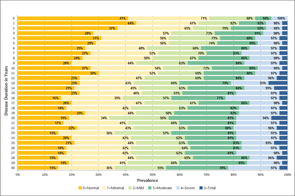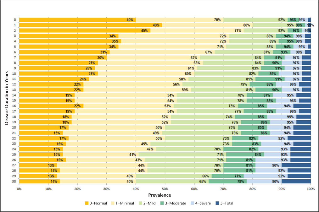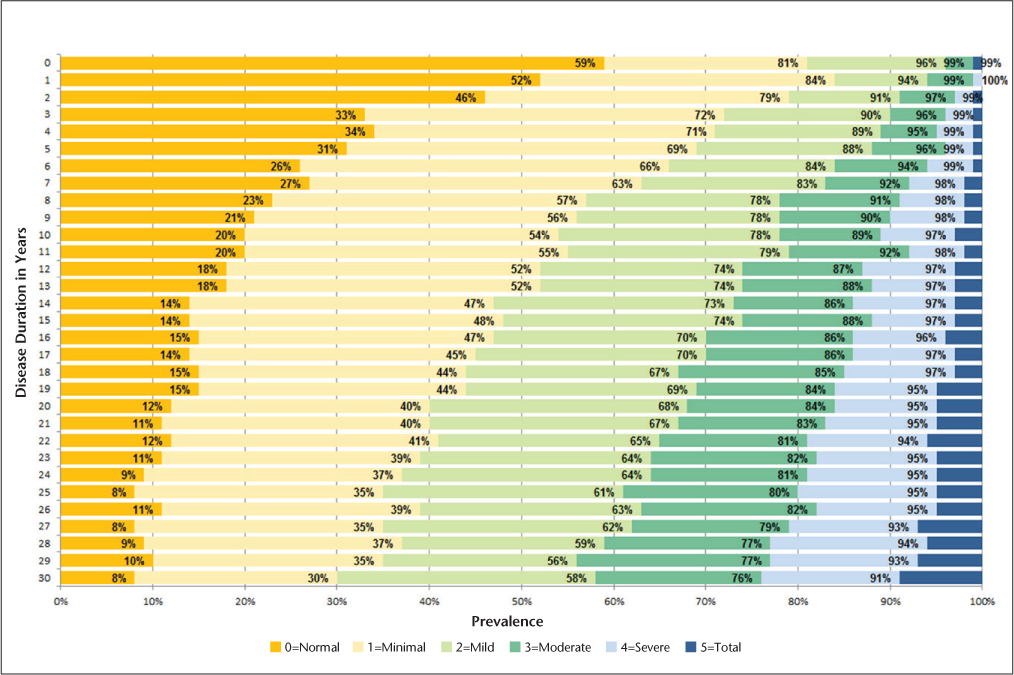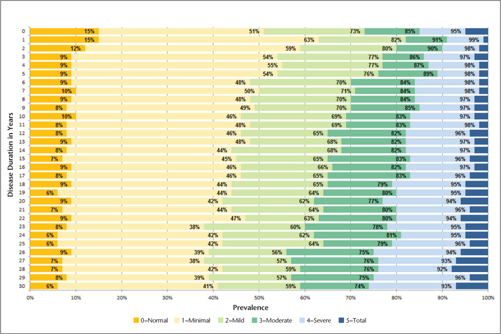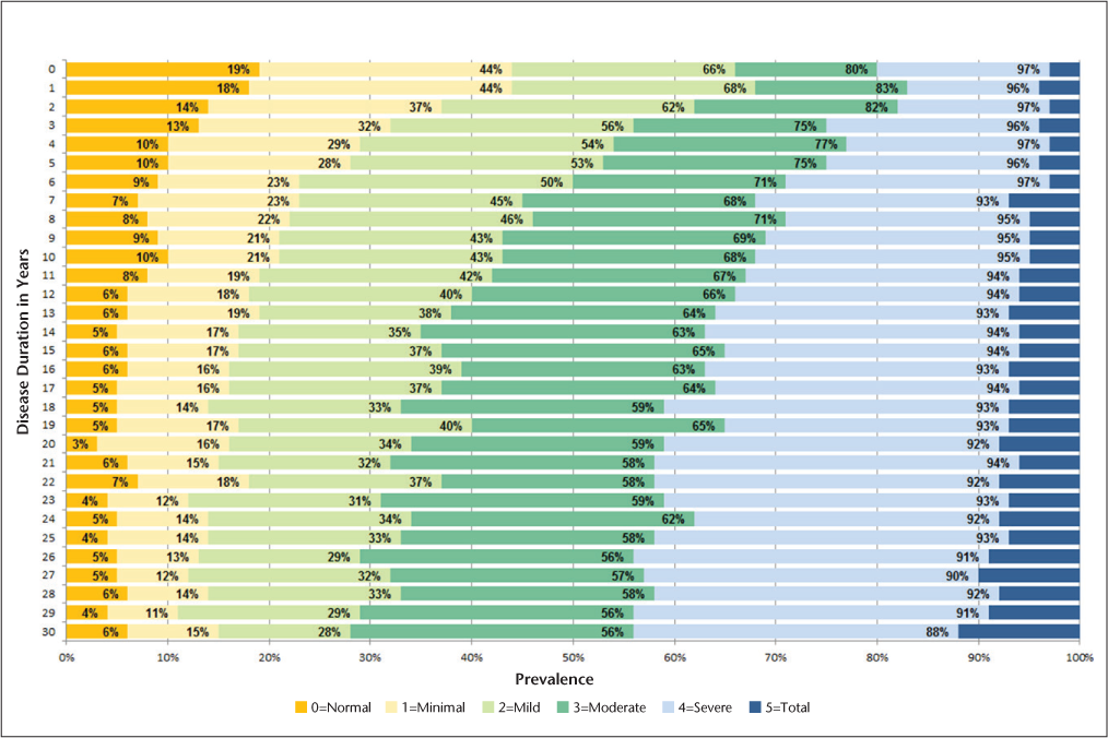 Disease duration is shown on the vertical axis and prevalence (cumulative frequency) on the horizontal axis. The outer boundary of each grade-segment marks off the proportion (in percent) of NARCOMS registrants whose self-rated impairment is equal to or lower than the corresponding PS grade relative to the total number of registrants with the given disease duration, while the inner boundary represents the proportion of registrants with lower PS grades. Segment length is equal to the percentage of patients with the respective PS grade.