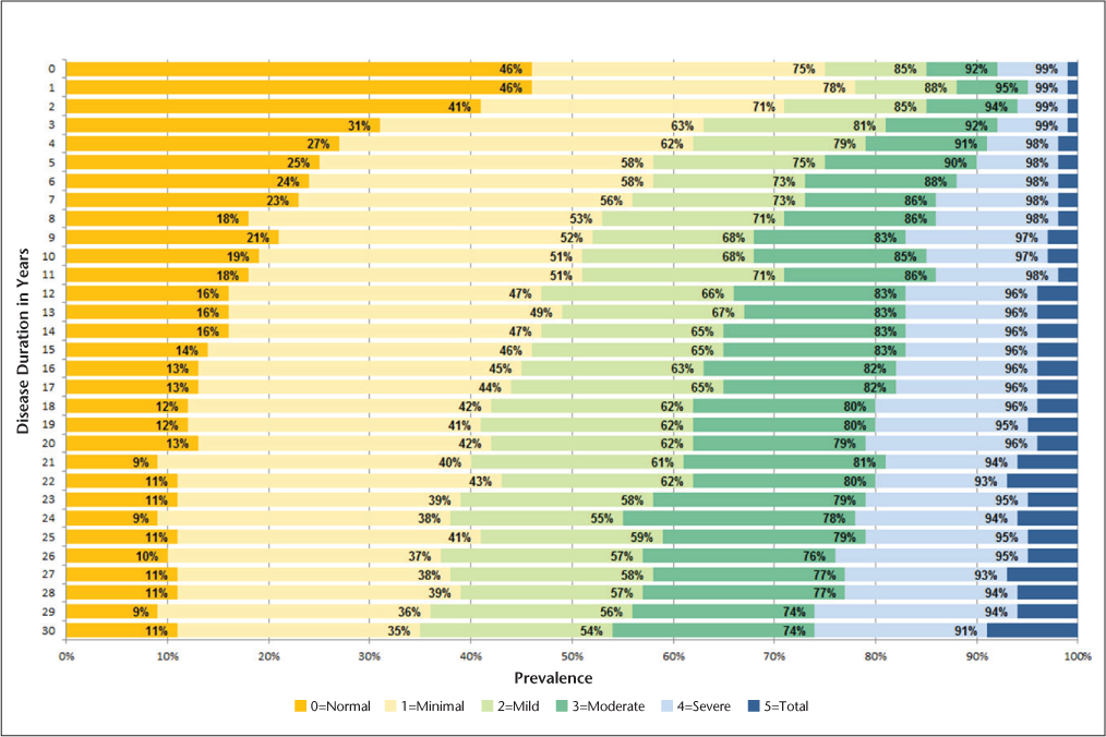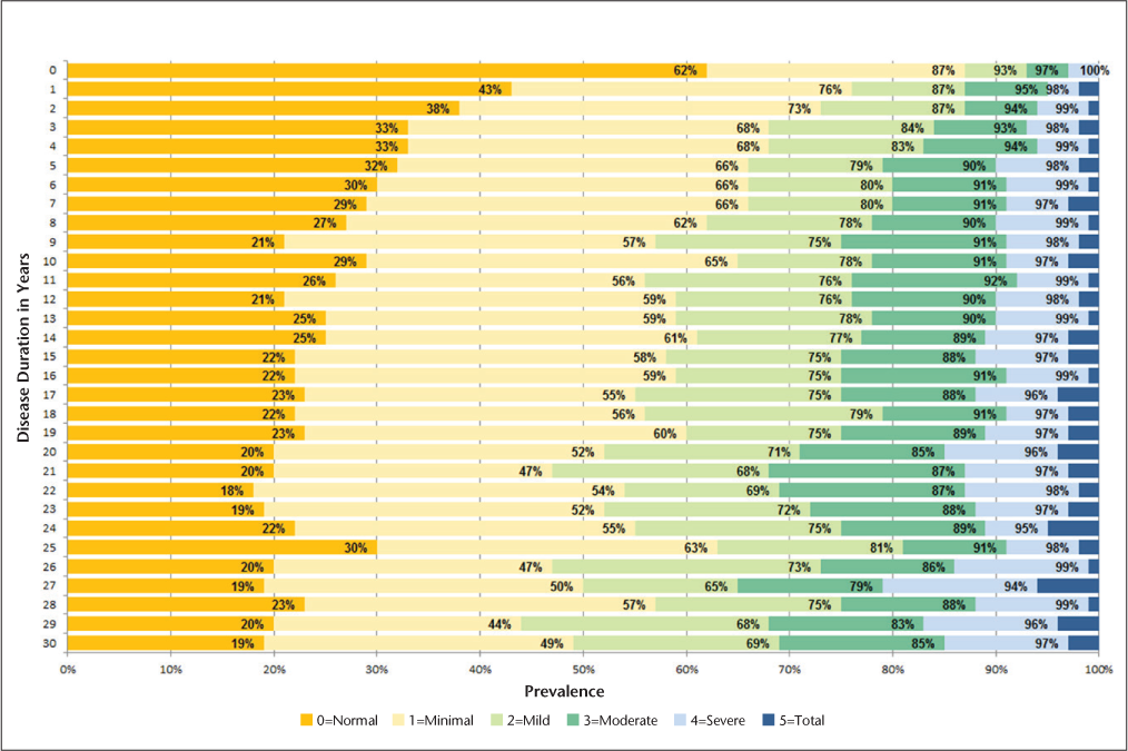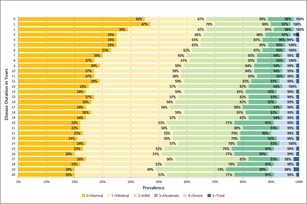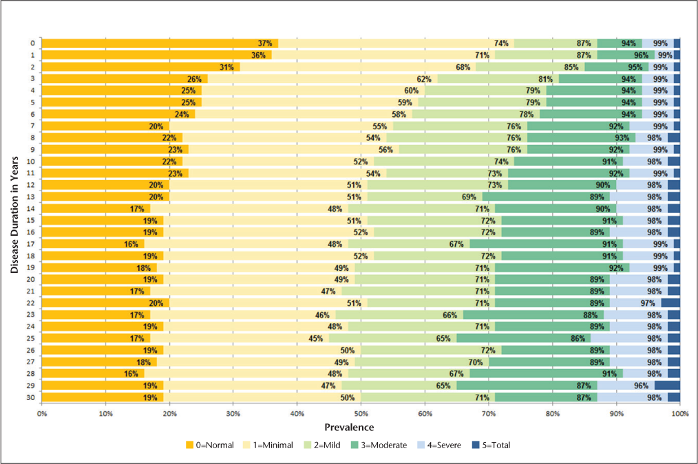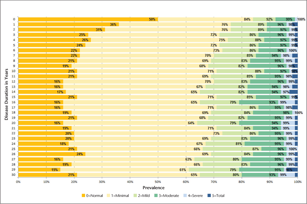 Disease duration is shown on the vertical axis and prevalence (cumulative frequency) on the horizontal axis. The outer boundary of each grade-segment marks off the proportion (in percent) of NARCOMS registrants whose self-rated impairment is equal to or lower than the corresponding PS grade relative to the total number of registrants with the given disease duration, while the inner boundary represents the proportion of registrants with lower PS grades. Segment length is equal to the percentage of patients with the respective PS grade.