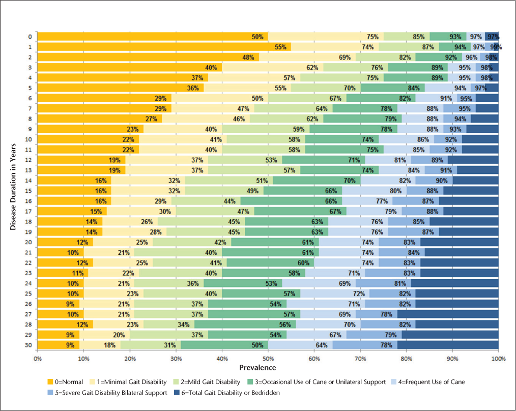 Examination of the symptom prevalence tables reveals that in nearly every domain, the majority of patients perceived some degree of impairment immediately after disease onset. Sensory symptoms and fatigue were especially ubiquitous: within the first year after onset, 85% of patients reported some degree of sensory symptoms (Figure 7) and 81% some degree of unexplained fatigue (Figure 4). Minimal or mild cognitive impairment (PS = 1 or 2) was noted by half of the patients (50%) within the first year (Figure 5). Mobility, generally thought to be spared in the first decade of disease, has been “noticeably affected” (PS = 1 or 2) in 35% of patients in the first year, and an additional 15% had at least an occasional need for a mobility device (PS ≥3) (Figure 1).