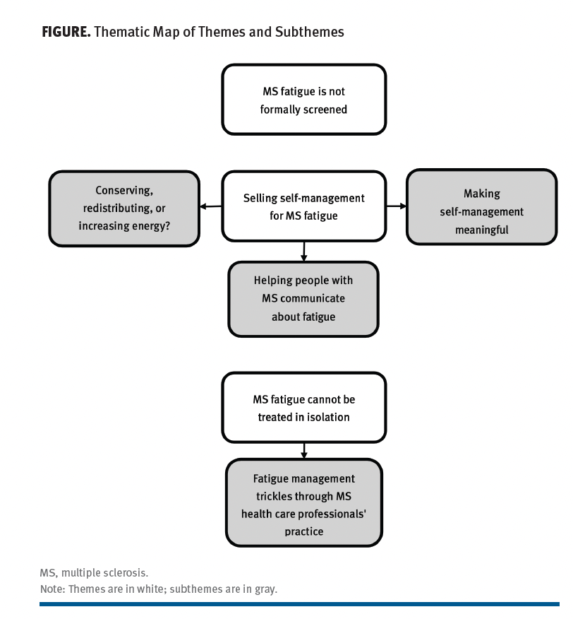 We currently know little about why people with MS are infrequently offered evidence-based treatments for fatigue, although there are some preliminary indicators from qualitative studies. In a study exploring beliefs about exercise and fatigue in MS, health care professionals (HCPs) expressed how difficult it can be to conceptualize, verbalize, and measure fatigue, despite it being a common symptom.7 Professionals spoke of having to do “detective work” to unpack how fatigue manifests in each person they treat, which, coupled with service barriers like time-restricted appointments, makes it difficult to detect and treat MS fatigue.