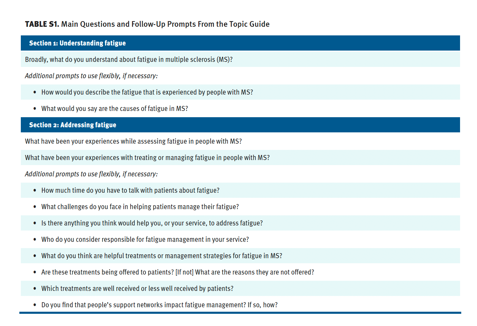 All HCPs gave informed consent and completed a questionnaire about their age, sex, professional experience, current role, and service through an online survey. Focus groups lasted between 103 and 120 minutes, whereas interviews ranged from 54 to 63 minutes, all conducted and recorded via Microsoft Teams. Audio files were transcribed by a third-party transcription company and manually checked by the research team. Transcripts were pseudonymized. Focus groups and interviews followed a topic guide developed with input from nonparticipant HCPs experienced in MS (Table S1) to explore fatigue assessment, management, and treatment experiences.