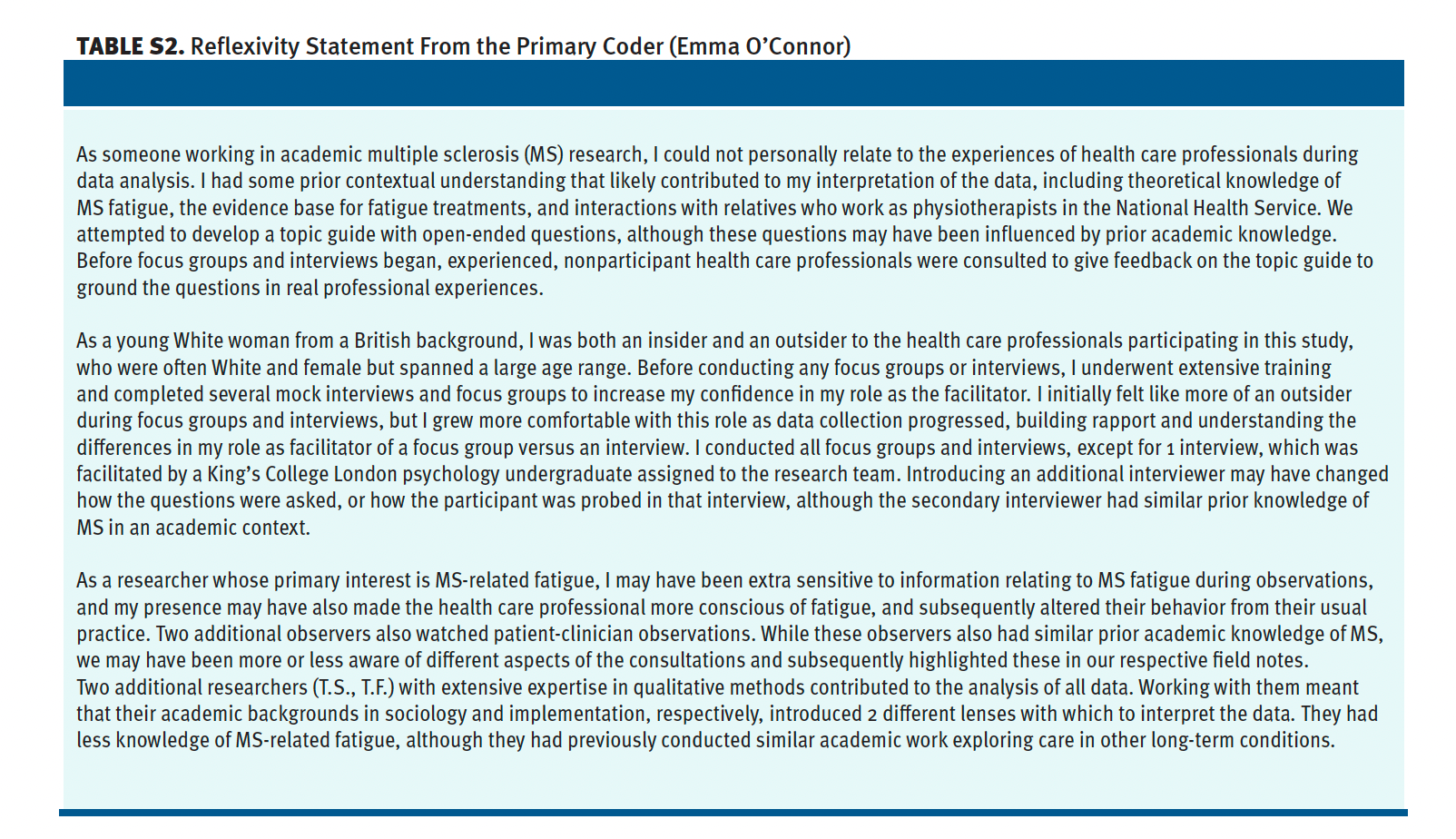 Predefined criteria and processes14 were followed to enhance the trustworthiness of the analysis. Regular data clinics facilitated discussions about coding and theme generation. A workshop with observers and the wider multidisciplinary research team helped contextualize the data regarding MS fatigue alongside qualitative insights from people with MS and their caregivers. Six MS HCPs, including 2 participants from focus groups/interviews, provided feedback on the analysis during a separate online workshop. The primary coder also consulted with a practicing occupational therapist in MS care. For a detailed reflexivity statement, see Table S2.