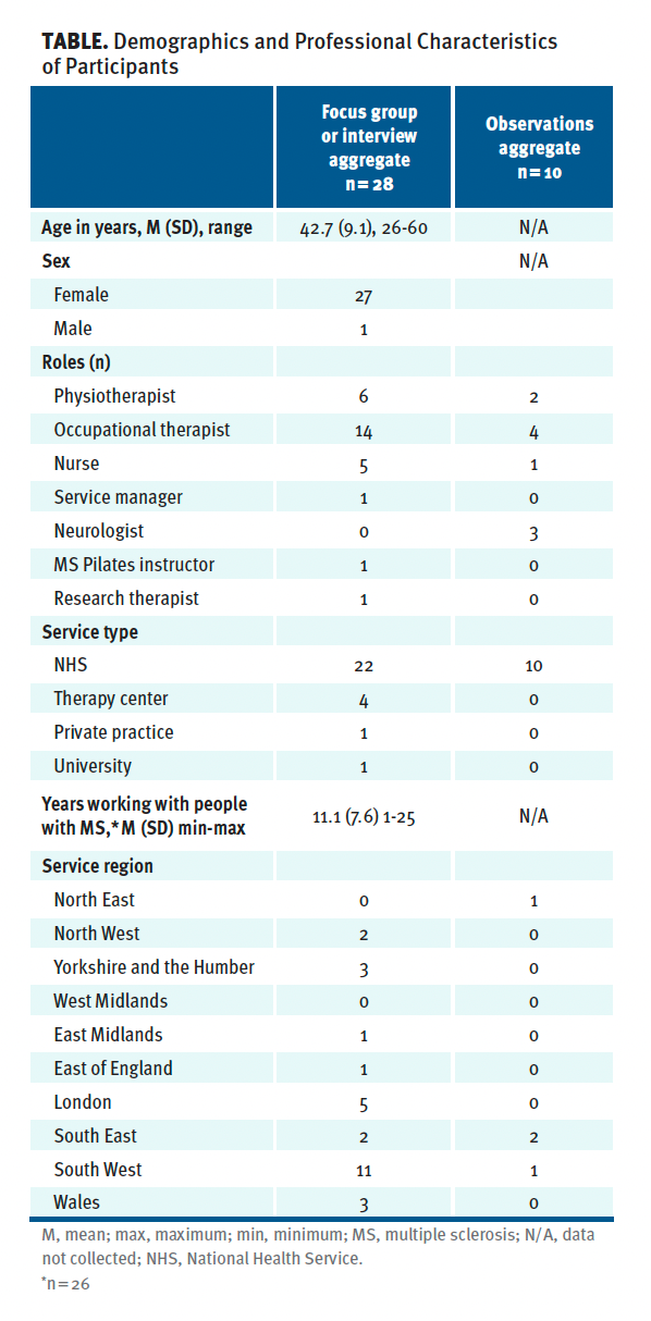 Participants were eligible if they were 18 years or older, lived and worked in the United Kingdom, and had experience working as an HCP with people with MS. Those invited to focus groups or interviews worked in the NHS, private practice, or nonprofit therapy centers. Observations took place in 4 NHS clinics in London, the South West, and the North East of England.