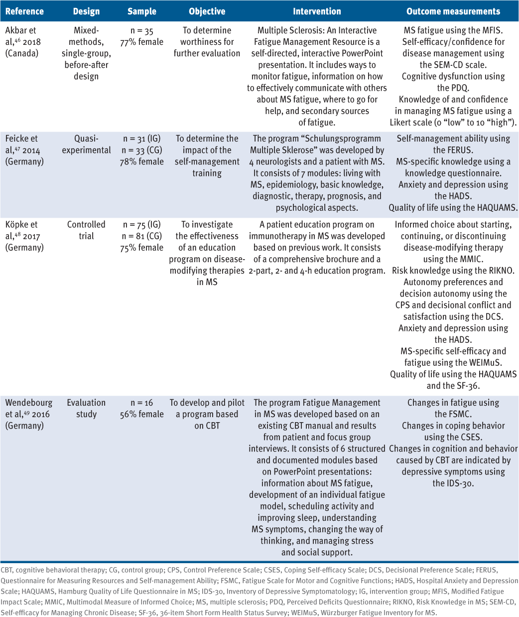 All interventions were educational and included training programs.46–49 Three of these training programs focused on MS management46,47,49 and 1 on a specific MS therapy.48 Two interventions involved training programs with PowerPoint presentations to improve the management of MS fatigue.46,49 One study reported that the intervention was performed by a nurse,48 another that the intervention was performed by a trained medical student,49 and the remaining 2 studies provided no information about the facilitator.46,47 One study focused on the self-management abilities of newly diagnosed patients with MS,47 and another on a training program about a disease-modifying therapy for patients with MS.48 Three studies with group training programs improved outcomes (ie, self-efficacy and self-management skills), although not statistically significantly in all cases.47–49