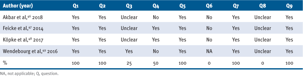 We used the Joanna Briggs Institute critical appraisal tools for quasi-experimental studies44 and qualitative research45 (qualitative part of any mixed-methods studies). Two of us (R.B., V.W.) independently assessed the quality of each article. Each item was judged with “yes,” “no,” or “unclear.” Any disagreements between reviewers were discussed and resolved by consensus. If consensus was not possible, a third author (M.K.) was integrated to reach a consensus. We did not exclude any study based on its quality.