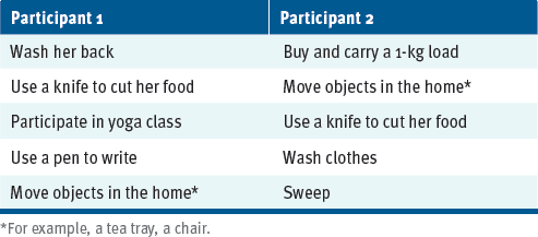 Participant 2 was a woman, aged 50 years. Her MS was diagnosed 12 years ago. She states that she feels numbness and tingling, and has decreased hand strength and endurance. Sometimes she is responsible for taking care of her grandson and her mother-in-law, who had a stroke. She is independent in all her self-care and mobility activities, but struggles with home maintenance activities.