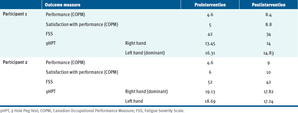 The results of this study indicate an improvement in goal performance and performance satisfaction for both participants, as a change of more than 2 points on the COPM31 is clinically meaningful. Likewise, the women’s 9HPT scores reflected improvement in dexterity. FSS scores also indicated reduced fatigue severity for both participants.