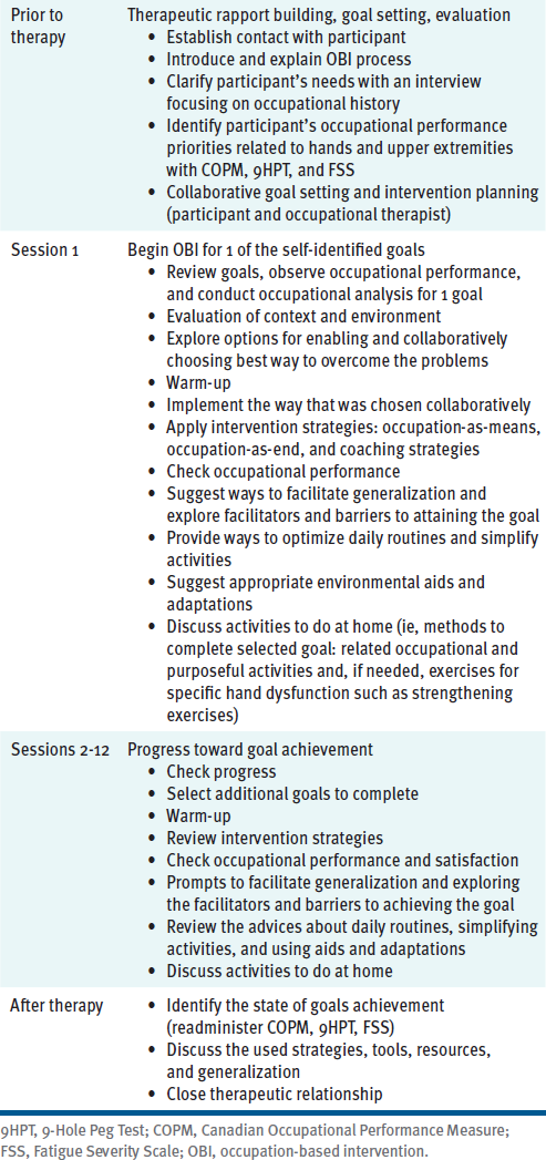 Initially, the primary clinical program was developed based on a comprehensive review of OBIs, as well as the biomechanical model and interventions used in rehabilitation of hand and upper extremities with persons with MS.24 The OBI used in this study guides patients through their self-identified goals regarding their occupational hand function. The developed intervention uses the Model of Human Occupation25 (MOHO) to describe occupational performance and participant involvement; motivation for, as well as patterns and performance of, daily tasks; and the fit between occupational goals, participant ability, and capacity in hand function and environment.26 The therapist used MOHO strategies to support the participants, including validating, identifying, giving feedback, advising, negotiating, structuring, coaching, encouraging, and providing physical support.26 In addition, solution-focused coaching,27 adult learning theory,28 solution-focused therapy,29 and self-management30 were used as components of the intervention. Each session was approximately 1 hour and occurred 2 times a week for 6 weeks. The content of the sessions was based on the participants’ selected goals and priorities based on the COPM (TABLE 1).