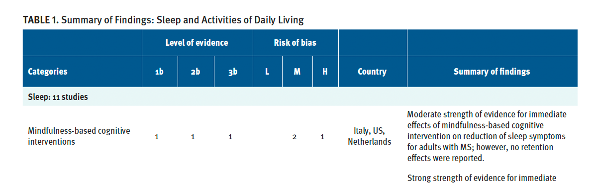Due to differing conditions and results, there is moderate strength of evidence (1 Level 1b study,13 risk of bias moderate; 1 Level 2b study,14 risk of bias high; and 1 Level 3b study,15 risk of bias moderate) supporting the immediate effects of an 8-week mindfulness-based cognitive training in a home setting (for adults with relapsing-remitting or secondary progressive MS with severe fatigue) for the mitigation of sleep disturbance symptoms. Cavalera et al13 found that, compared with those who received psychoeducation, adults with MS who received mindfulness-based cognitive training demonstrated statistically significant improvement of sleep symptoms at posttest (Medical Outcome Study Sleep scale); however, no retention effects were found at 6 months. Lorenz et al14 reported that, after receiving an 8-week mindfulness-based stress reduction course combined with sleep hygiene education, adults with MS showed immediate reduction of nighttime awakening, but no significant improvement at 3-month follow-up. Hoogerwerf et al15 reported that, after receiving mindfulness-based cognitive therapy, no statistically significant improvement in sleep symptoms was found in adults with MS who experienced severe fatigue, (sleep subscale of Symptom Checklist-90), across pretest, posttest, and 3-month follow-up.