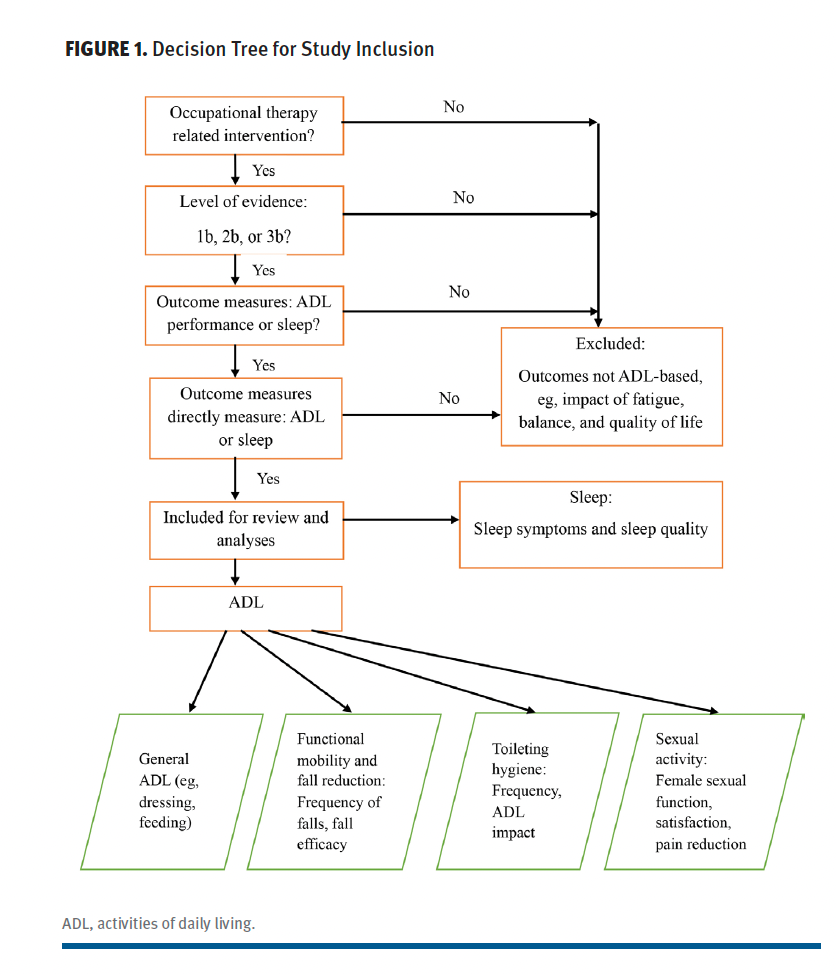 Inclusion criteria for studies were that the participants were adults (≥ 18 years) with MS; that the interventions addressed overall (general) ADL, other ADL (including falls and functional mobility, toileting hygiene/continence, and sexual activity), or sleep; and that the interventions were within the scope of OT practice (Figure 1). Articles had to have a quantitative methodology (as adapted by AOTA8) and relevant outcome data7 at evidence levels 1b, 2b, and 3b: